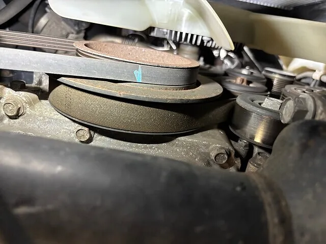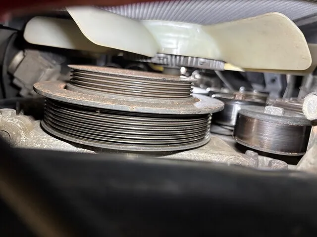 エンジンルームを覗き込むと、普段は気に留めないプーリーが目の前に現れます。
